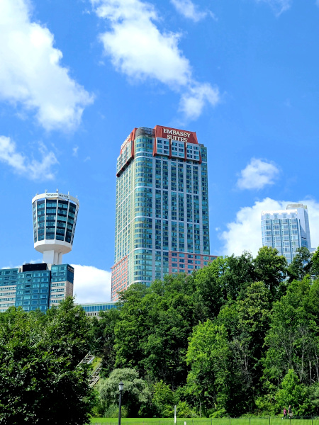 Dentro de estos hoteles se encuentra Sheraton Fallsview Hotel (el cual cuenta además con un casino), Embassy Suites by Hilton Niagara Falls Fallsview, Niagara Falls Marriott on the Falls y Crowne Plaza Niagara Falls–Fallsview, solo por citar algunos ejemplos. Este último, Crowne Plaza Niagara Falls-Fallsview, cuenta además con Prime Steakhouse, el restaurante número uno y más popular en Niagara Falls.