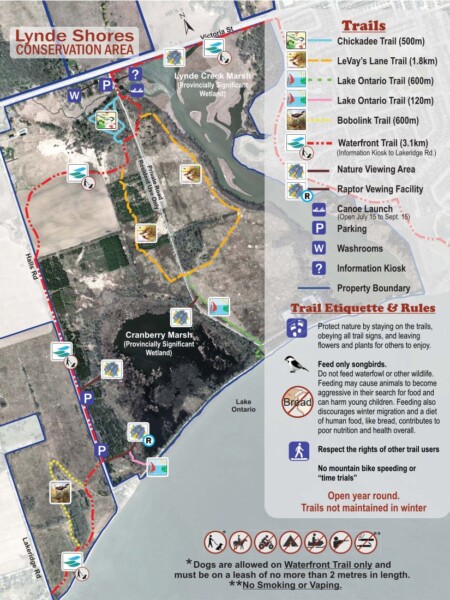 Lynde Shores Conservation Area es atravesado por el Great Lakes Waterfront Trail (sendero representado en el mapa con el color rojo). Por este motivo, una opción excelente para visitar el área es en bicicleta.