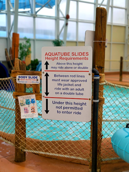 Los dos toboganes que se encuentran en la zona más alta son para usarse con flotadores, ya sean simples o dobles. En diferentes lugares del parque podrás encontrar especies de carteles que te permitirán medir la altura de los niños y determinar si pueden usar los flotadores con un adulto o solos. Para que tengan una idea, Beatrice, que recién cumplió 4 años, mide 101 cm y pudo usar el flotador doble, todavía le faltan algunos centímetros para poder usarlo sola.