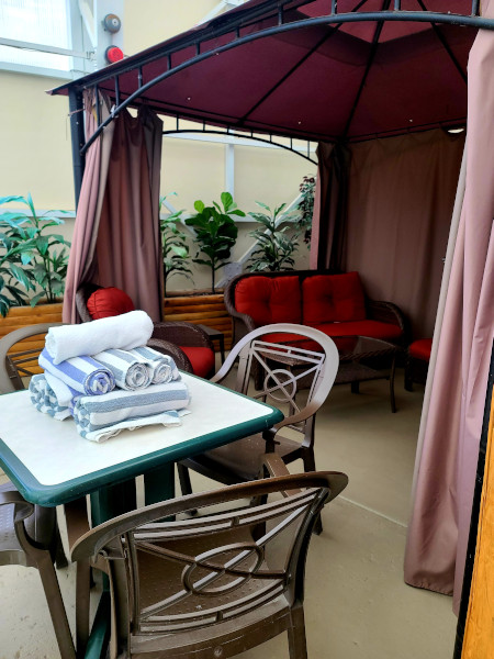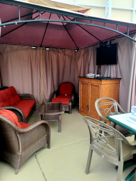 El parque cuenta con dos cabañas ubicadas al fondo de la piscina de olas. Las mismas consisten en una especie de pergolas y cuentan con un juego de patio muy cómodo (sofá y dos butacas), un televisor, un mini refrigerador (con botellas de agua incluidas), una mesa con 4 sillas, una zona para colgar la ropa mojada, toallas y un teléfono (desde el cual puedes llamar a la cafetería y solicitar comida y bebidas).