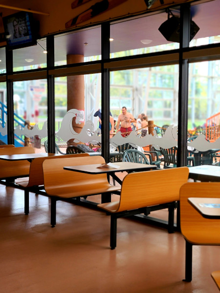 Recuerdo que una vez visitamos el Fallsview Indoor Waterpark cuando Beatrice tenía alrededor de 10 meses y habían tantas personas que estuvimos horas con ella dormida en los brazos porque no encontrábamos un lugar donde sentarnos. No queríamos correr el riesgo de pasar por una situación parecida. Por suerte en este parque limitan la cantidad de personas y no estaba para nada concurrido, de hecho habían muchos sitios con mesas y sillas vacías.